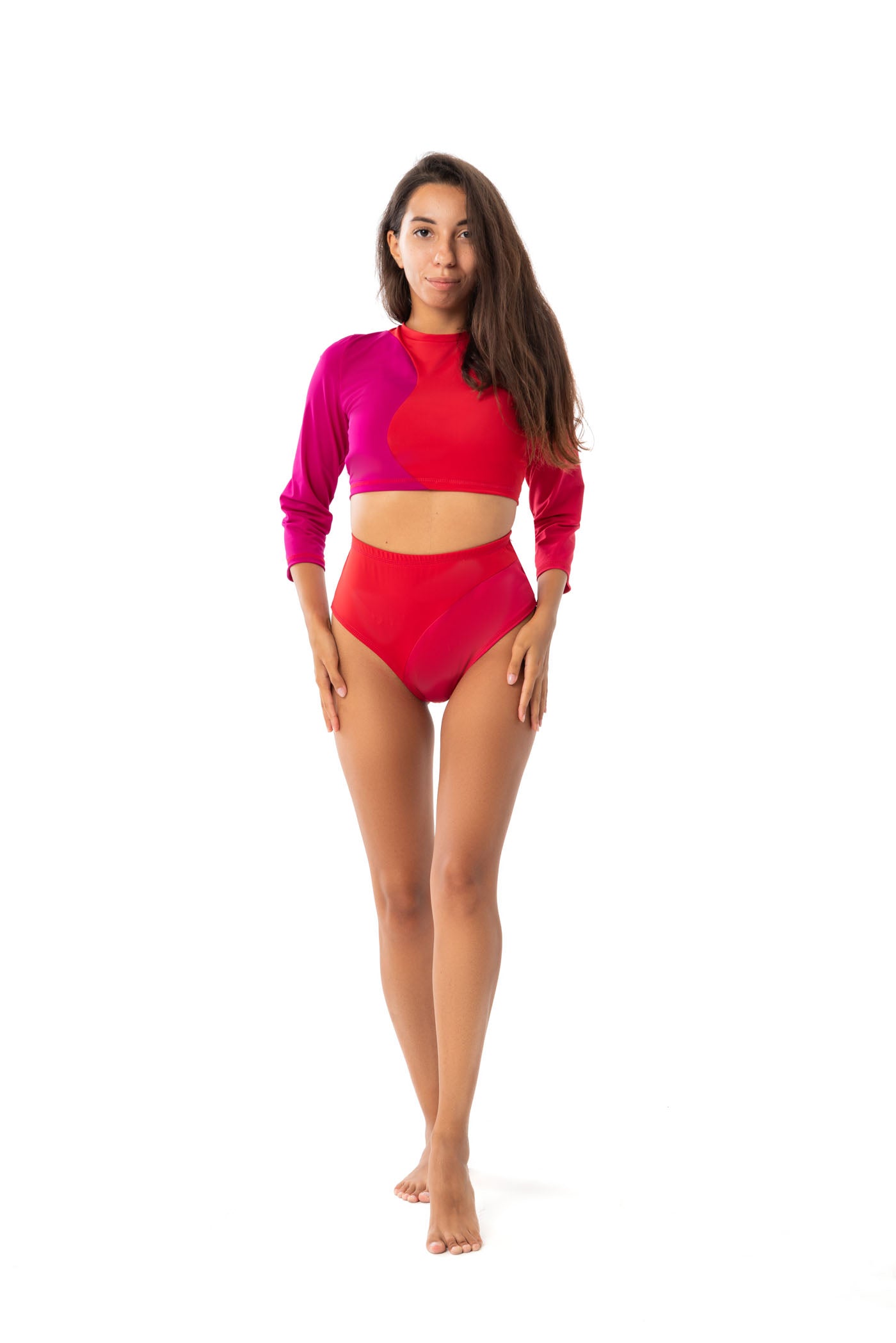 These bold, high-waisted bikini bottoms combine vibrant color-blocking with a flattering silhouette. The contrasting red and magenta tones create a striking look, while the high-rise design offers both comfort and style. Perfect for mixing and matching with your favorite bikini tops, these bottoms are ideal for making a statement by the pool or on the beach. Crafted from durable, UV-resistant fabric, they ensure you look chic and feel confident all day long.